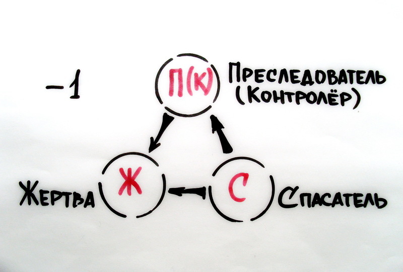 Например, Победитель может влюбиться в «неподходящую» женщину, и если с отношениями у него не все в балансе, то инстинкт его подведет — эта женщина будет Жертвой. Он может начать ее «спасать» и «воспитывать», стремясь подтянуть до своего уровня. И…автоматически проваливается в «-1-й треугольник», где вчерашняя Жертва начинает его «строить», активно требуя дальнейших знаков внимания к себе. Если он это принимает (потому то «Любоф-ф!!!»), то сам превращается в Жертву, а вчерашняя Жертва – в Преследователя-Контролера. Это то, что в народе называется «Сесть на голову и свесить ножки».