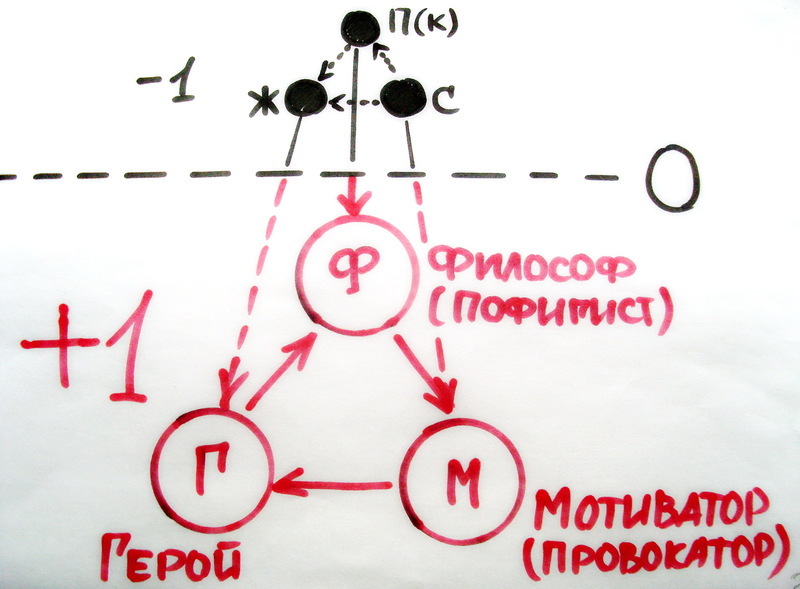 В парных отношениях закон неумолим: в «-1-м треугольнике» – страдание. В двух верхних – разное, но СЧАСТЬЕ. Если в паре появляется персонаж из нижнего треугольника – это путь конфликта. Ясно, что конфликт нужен персонажам пьесы, это их Путь Героя. Если Победитель встречает рабыню и влюбится в нее, и тут она начинает вредничать: «Почему ты не выбил ковер или почему задержался на работе», то у него большое искушение или начать это принимать (женский Путь Героя), или избавиться от нее, как от надоедливой мухи. И это каждый раз – Решение и вполне конкретный вектор развития. Готовых ответов тут нет, потому что все мы разные, и нужно нам разное. Следует помнить, что Победитель тоже может иметь свои «недоделки» — уроки, которые он не прошел в свое время как Герой. И в этом месте Жизнь всегда будет его провоцировать, пока он не отработает блок, мешающий течению энергий.