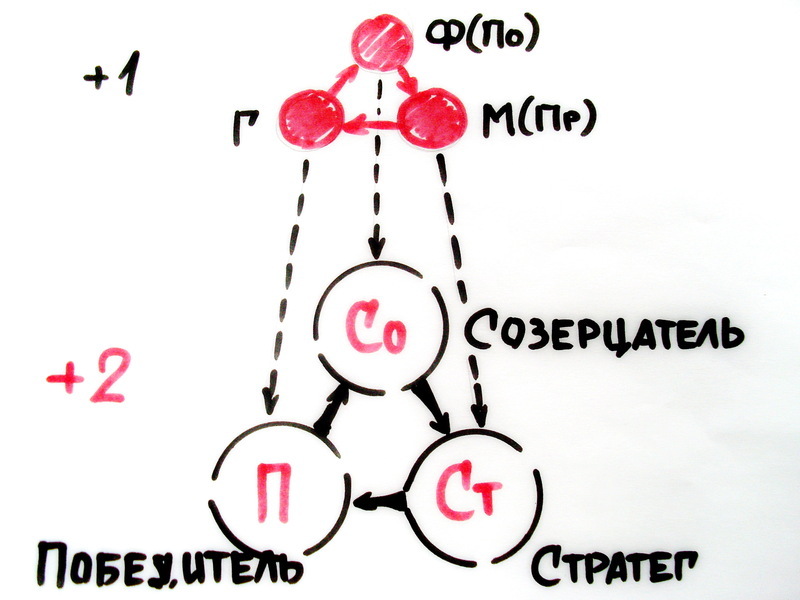 Выйти во второй треугольник можно только через полярность, когда все три первые субличности трансформируются в свои противоположности. Потому что мы помним, что «- 1» треугольник на шкале в «минусе». Переходя через точку «0», минус меняет знак на противоположный.